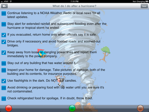 You will be able to save your progress on memory for many important recommended tasks before, during and after a hurricane in the following categories: