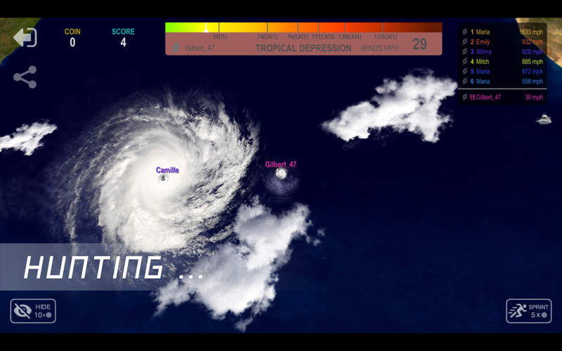 It’s just a inconspicuous cloud when you start, but you will grow into a super hurricane. In this process, you have to continue to absorb the energy on Earth. But also you face other strong competitors from around the world. They want to swallow you all the time. Your energy is from air or ocean, water, cloud and heat. To kill small hurricanes will make you grow quickly. The ideal living environment for hurricanes is on the ocean. On the land will lose energy. But if you are strong enough, Nothing can stop you!