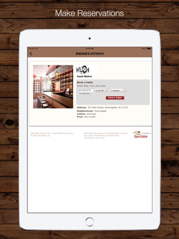 The official Hush Bistro app allows you to view the latest seasonal menu items, make online reservations using OpenTable, and get directions to Hush Bistro from your current location right from your iPhone or iPad.