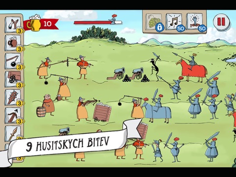 - na každého křižáckého darebu platí jiná husitská zbraň. Zbraně lze kupovat za pivo, které vaří sládci, které je nutno správně takticky rozmístit tak, aby bylo vždy dostatek piva i tím i zbraní