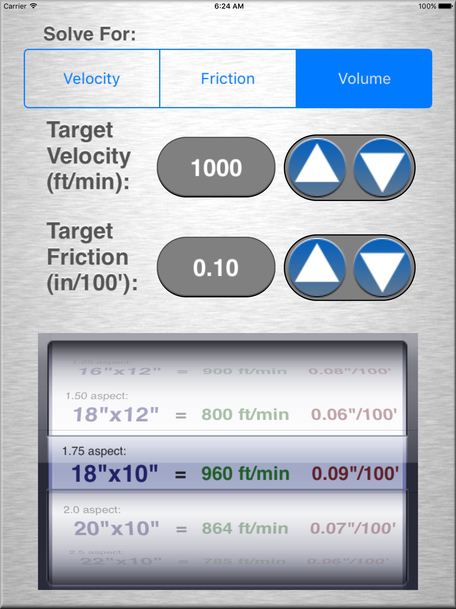 The app goes beyond simply calculating velocity, friction, or volume; It also offers a list of every even sized duct that meet the design criteria for the user to review and consideration at various aspect ratios.