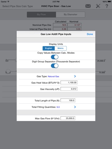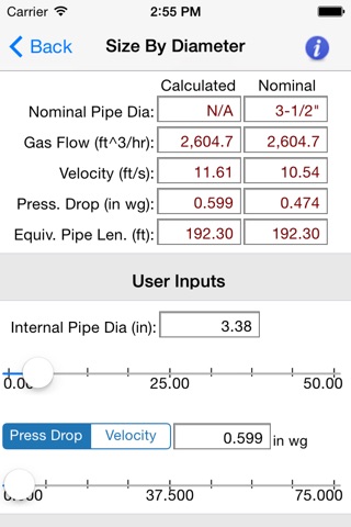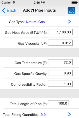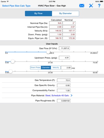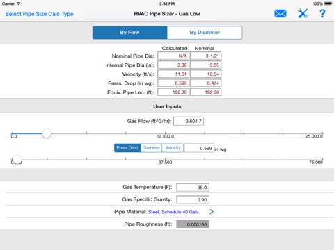 You can specify additional parameters such as the type of gas, various properties of the gas, the pipe material type, the total length of pipe, quantities for up to 11 different types of pipe fittings, and much more. You can also choose to display values in either english or metric units.