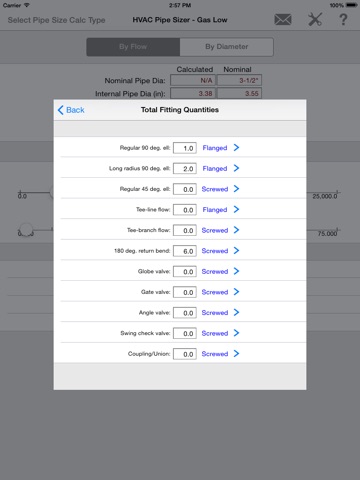 This application includes built-in pipe fitting equivalent length and nominal pipe sizing tables for a wide variety of pipe material types and diameters.