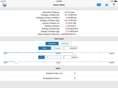 The "Steam Tables" module allows you to calculate the properties of saturated or superheated steam by specifying 2 input properties. This module is also part of the "Pipe Sizer - Steam" module discussed below.