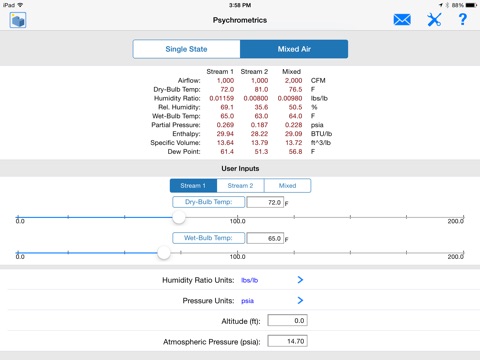 The "Psychrometrics" module allows you to easily perform single-state and mixed-air HVAC psychrometric calculations for up to 23 different combinations of input parameters.