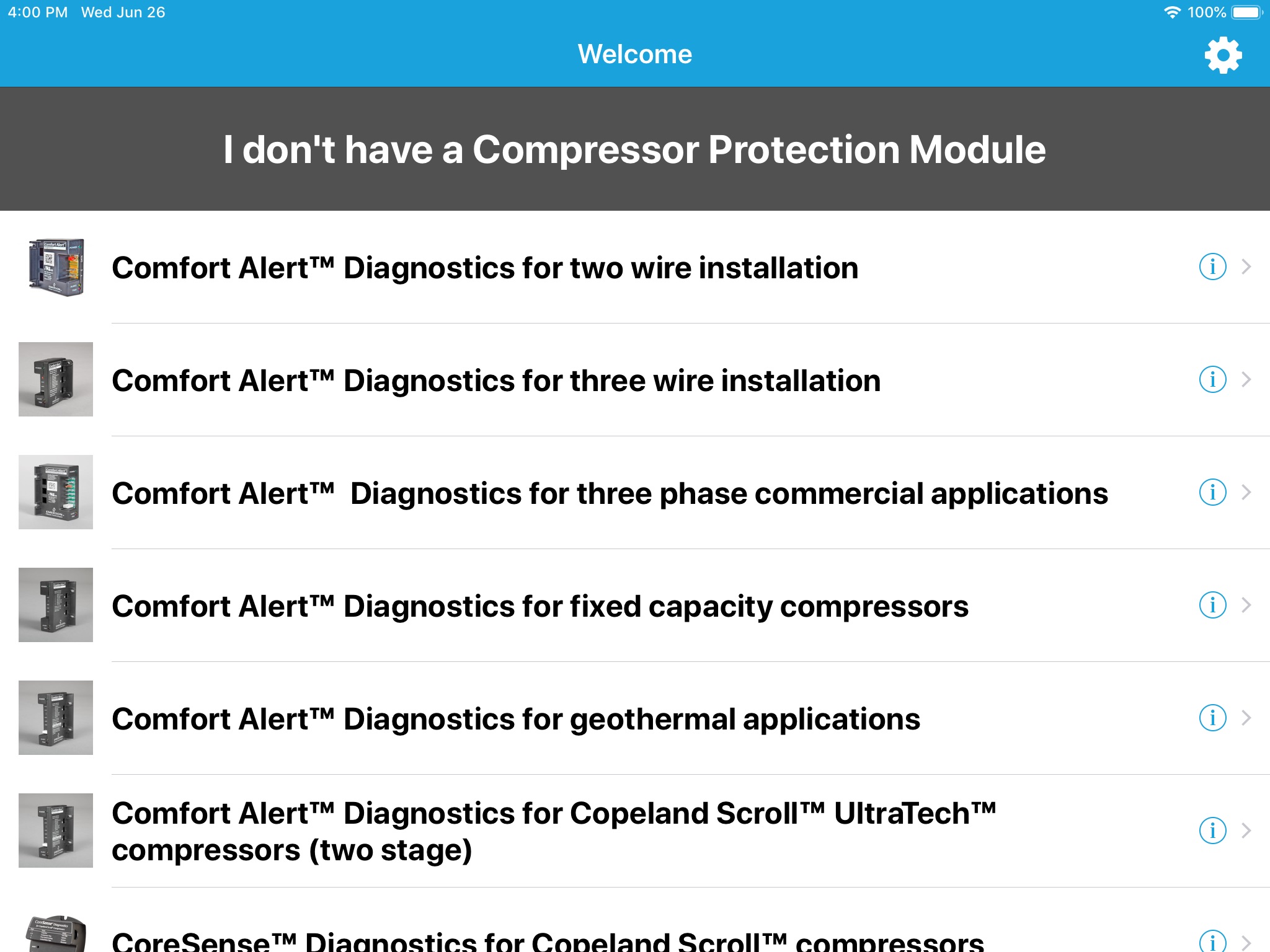 This app allows contractors to easily access compressor electronics product specifications along with the ability to interface with and diagnose the system. Contractors can choose to enter the flashing “alert” code from the electronics module or use a tap feature to help identify the code. Entering the code, gains them access to troubleshooting “tips and tricks” as well as an interactive flow chart to aid in diagnosing system problems.