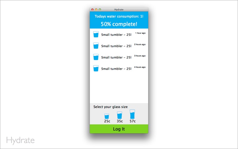 Hydrate uses figures from The European Food Safety Authority to ensure your drinking the minimum amount of water recommended for you. With built in support for Apples Notification Center, you will never forget to drink another glass of water again!