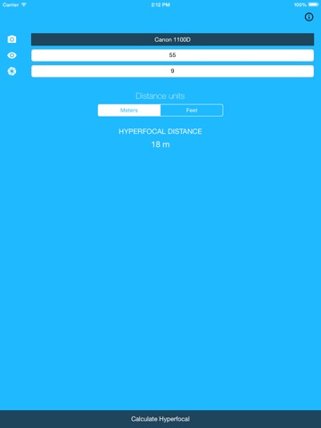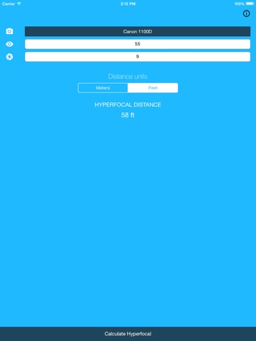 With this app, you can calculate hyperfocal distance in an easy way. Just pick your camera model from the list, set your focal length and aperture used, and click on "Calculate Hyperfocal". Thats all!