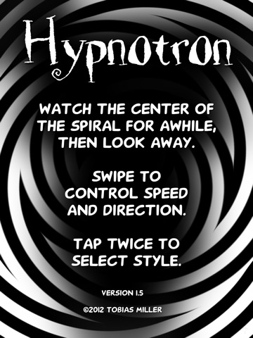 Hypnotron contains six unique effects, carefully rendered and calibrated for maximum effect on the iPhones screen. High-contrast patterns produce the best optical after effect, so for best results, Hypnotron is entirely in black in white.