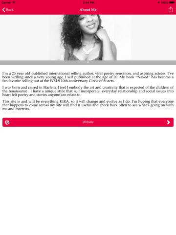 Download the viral poetry sensation and aspiring actress, Kira J app. It features video poetry recitals from Kira J and videos from other viral sensations with deals, product offers and other info on selected topics you can view from with the app.