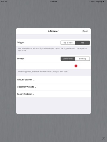 The i-Beamer app controls i-Beamer Laser Pointer. Simply plug an i-Beamer Laser Pointer into your iOS devices audio jack, and run the i-Beamer app. You can then use the app to turn on and off the laser pointer during your presentation.