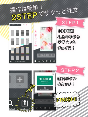 ・デザインを決めて、注文ボタンをタッチ。写真や画像を入れたり、スタンプやコロコロペンで飾ったり、お好みに合わせてカスタマイズが出来ちゃいます。