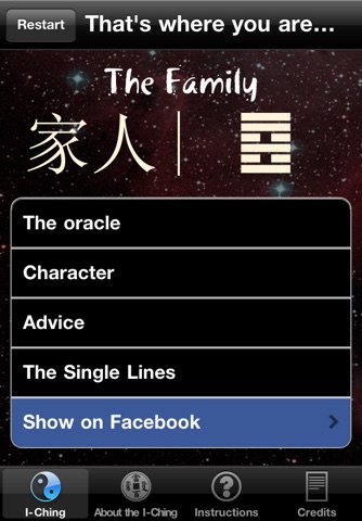 Please notice! The free version of the I-Ching oracle is the basic one that shows the questioner his State of Affairs. To view all functions and oracles please get the full version as an In-App purchase for only USD 3.99.-