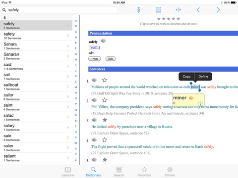 11. Most of the words in the text can be searched when you select them, a small description bubble will show, click the small horn to hear the pronunciation.