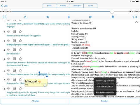 1. Custom select reading region, speed up or rewind with up to 0.1 second accuracy, easily select word and even parts of a word to listen to, write down, and even to test if your pronunciation is correct.