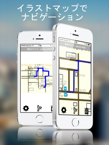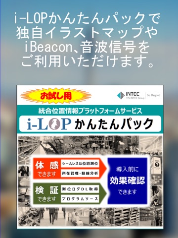 本アプリはサーバからダウンロードしたデータに基づいてイラストマップを表示します。屋外マップから屋内マップへの自動切り替えも可能です。マップの切り替えには、iBeacon や 音波信号を発信する当社製ID発信機を利用します。