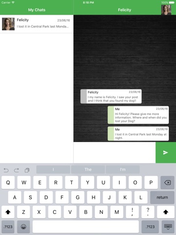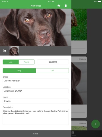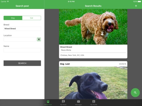 Publish a Post with : photos , description of the pet, breed, geographic location and name.