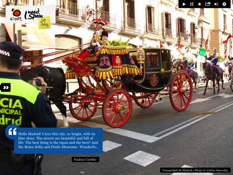 I Need Spain is an application developed exclusively for iPad that allows users to tour Spain interactively. All content, whether images, text or audio, has been created and shared by users directly on the different social network sites set up by Turespaña, a State Administration body that is responsible for promoting Spain as a tourist destination abroad.