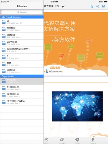 Client of i2Share, an online file storage and collaboration tool. i2Share enables you to build private cloud for file sharing and collaboration among team members in your company/organization. This is the IOS client of the i2Share system.First you create a file library in the web and upload files to it. Then you share it into a team or with another user. File libraries can also be synchronized among computers and mobile devices. You download a library to your PC. Whenever you add, delete or edit a file, the latest version be uploaded to the server automatically and then be synchronized to everyones computer.