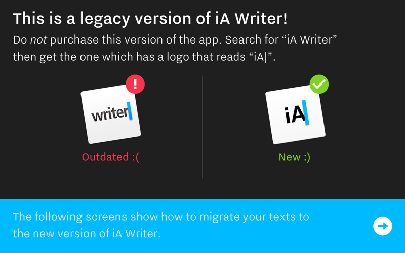 This update is for customers who previously purchased iA Writer Classic, which was removed from sale last year. New customers should purchase the new iA Writer with the “iA|” icon instead of this version.