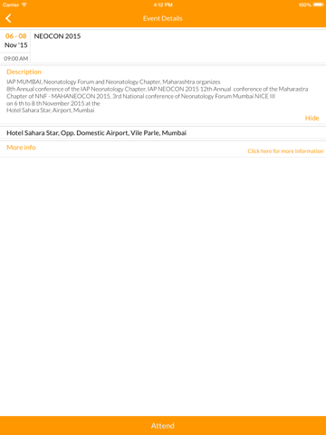IAP Mumbai app will show you all the academic events and CME on your handheld device. You can indicate your interest to attend an event by clicking on the green tick mark in front of the event. This saves you from seeing an SMS of an event you wished to attend but forgot to check it when in front of the laptop.