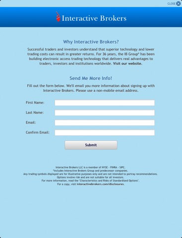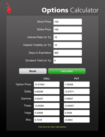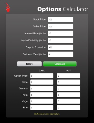 The idea behind doing an options calculator for iOS is awesome. IB typically has outstanding technology so it is surprising to see the details that were left out of this app. 1. The numeric entry keypad uses a phone layout and there isnt a decimal point so the only way to enter a number with a decimal is to edit the default data - poor execution. 2. There isnt a way to enter default values for some of the values e.g. every time a new calculation is initiated the interest rate has to be changed. 3. It doesnt support multi tasking and every time you go back to the app the T&Cs have to be checked off and all the default data in the sample screen is in the data entry, the previous calculation erased. I am a fan of IBs technology and have the option calc widget on my desktop. This app is free, has a marginal interface, and no multi tasking support. Hopefully later versions live up to IBs standards.