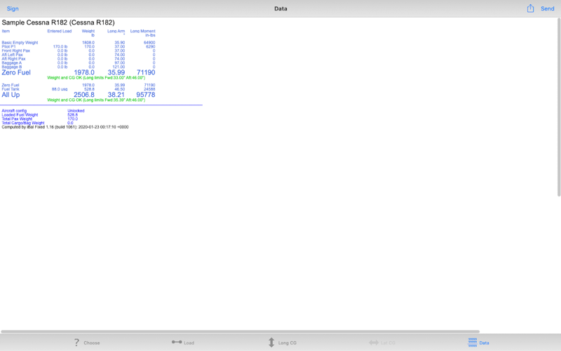 Support for optional Passenger names and Flight Details which appear on the CG solution spreadsheet and are transmitted when Send tapped. This supports new FAA rules requiring FAR Part 135 (Air Taxi) Operators to manifest every flight stage and for it to be transmitted back to base.