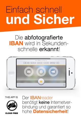 Sie sparen Zeit und Nerven - und das bei maximaler Sicherheit: Denn der IBANreader ist Cloud-frei! Er benötigt keine Internetverbindung, sondern verarbeitet die Daten ausschließlich auf Ihrem iPhone. Das scannen funktioniert auch im Flugmodus.