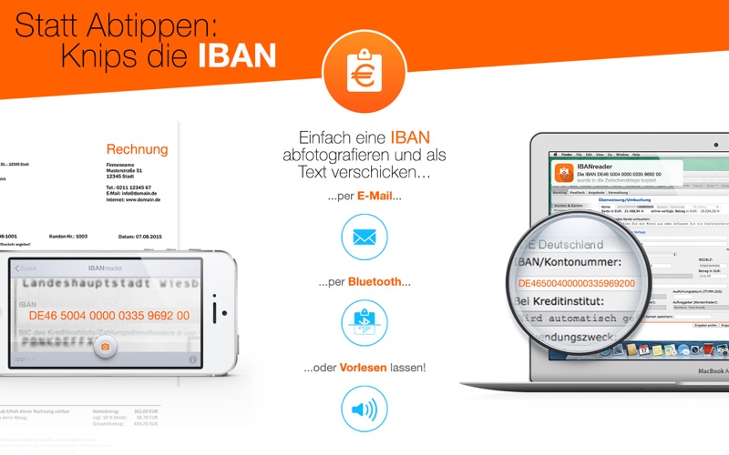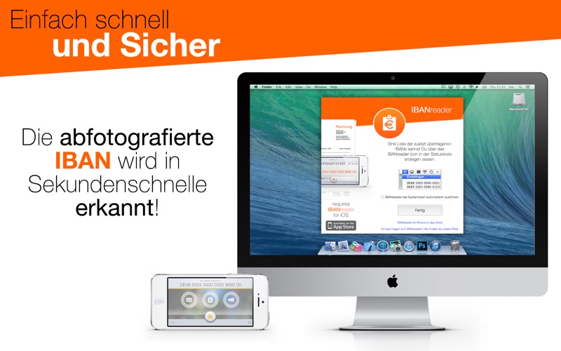 Mit dem IBANreader für iPhone scannst Du die IBAN sekundenschnell und schickst sie über eine gesicherte Bluetooth LE*-Verbindung an Deinen Mac-Client. Dort kopierst Du sie in das passende Formularfeld Deiner Banking-Software - fertig. Schon hast Du durchschnittlich 45 Sekunden Lebenszeit für schönere Dinge eingespart.