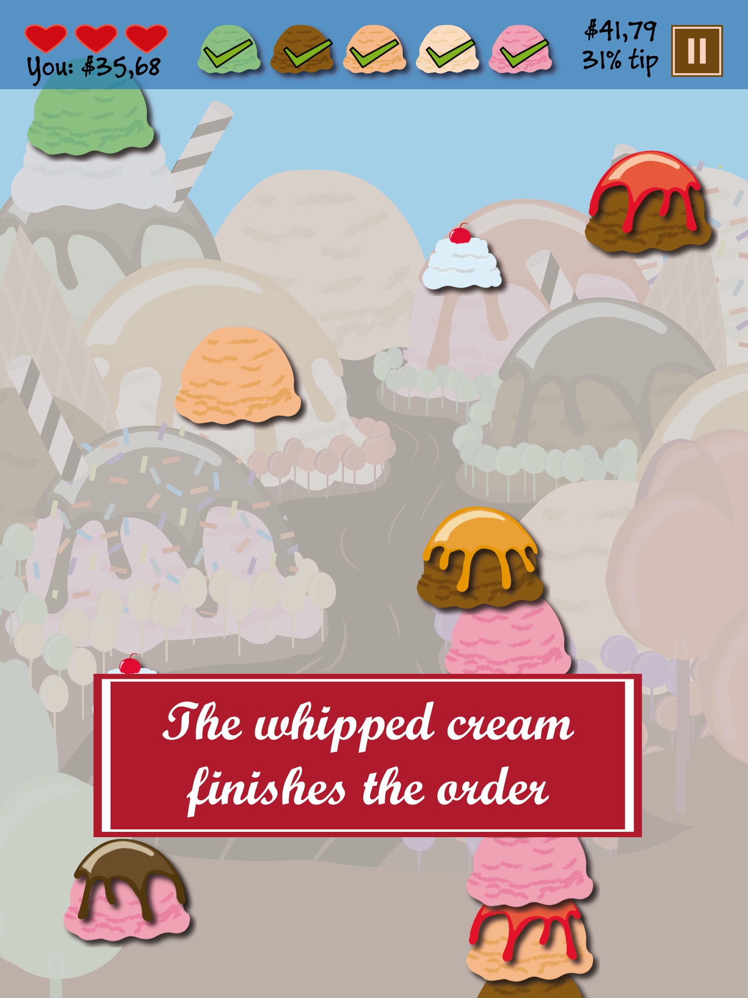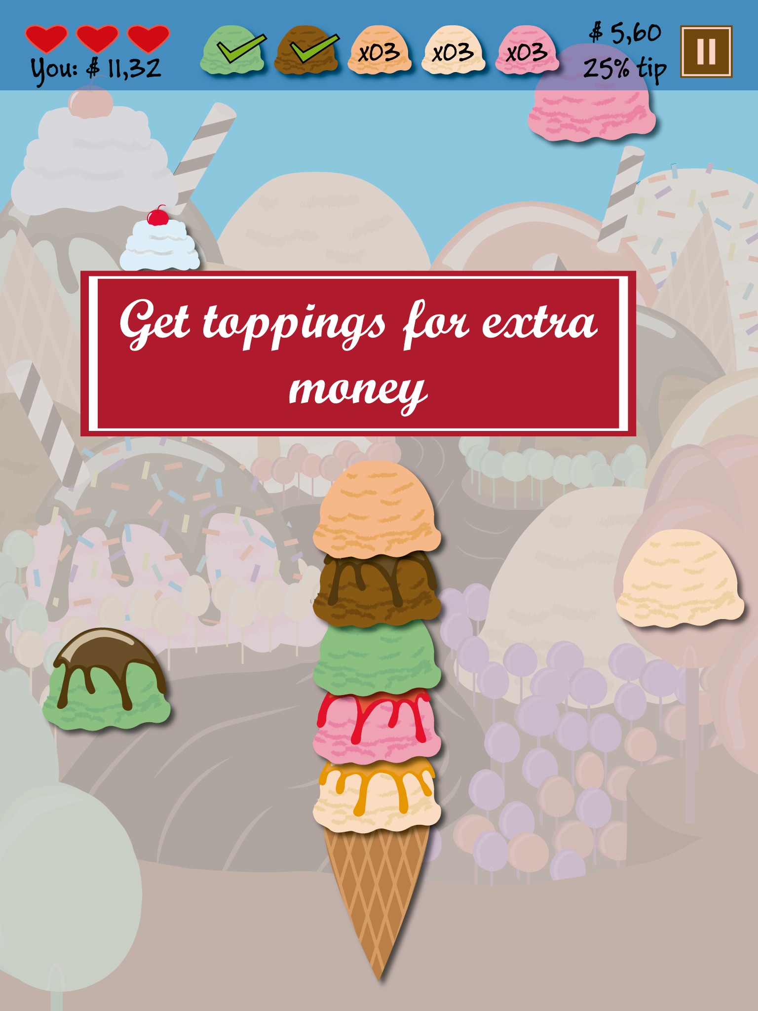 In this amazing game, the user is asked to make an ice cream with many flavours. Get the correct flavours to get the full tip.