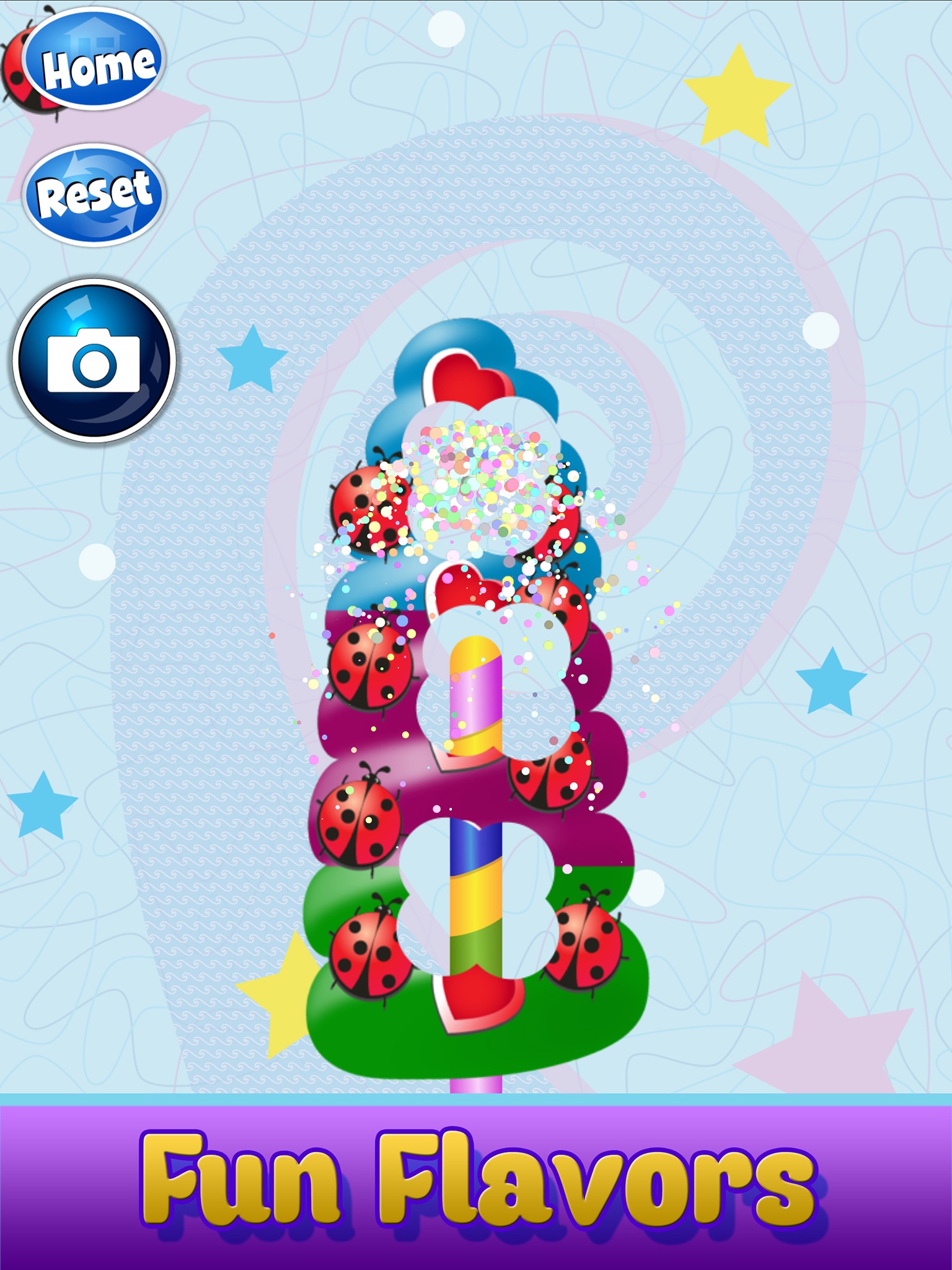Time to Decorate! Choose your style, background & decorate your ice pop with fun shapes, candy, icing and toppings!! Apply frosty coatings using your finger. Tap to add sprinkles, candies & sweets. Add Fun items and pinch open/close to make them big or small! Change backgrounds. Now its time to Eat your frozen creations!
