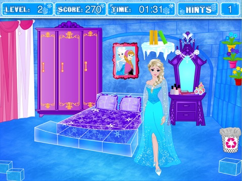 Ice Queen is back from her exile, and Arendelle was celebrating the return of its queen all night long! There was a huge party in the royal palace as well, and of course after a huge party a huge mess is left over. Help Ice Queen and her maids clean up two palace rooms and the park.