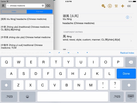 • Search for the occurrence of a Chinese character or word anywhere in the entry. Browse through the list of results with a thumb index, sorted by where in the entry the search term was found (position 1, position 2, ...)
