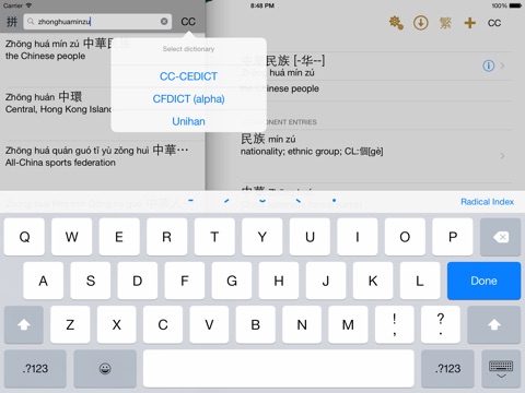 iCED Chinese Dictionary presents a unique way to use a Chinese dictionary. After youve found the entry you were searching for, iCED will continue to search for compound or component entries to complement your search. Component entry dissection allows you to quickly understand the meaning of components in longer words or phrases. For example, if you look up 中华人民共和国, iCED will also look up 中华 and 人民共和国. You can then select the latter to break it up into 人民 and 共和国. When you get to single characters, iCED will look up compound entries starting with that character.