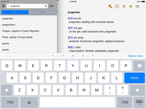 • Integrated search across all dictionaries using English words, Chinese characters (using the Chinese hand recognition built into the iPhone OS), Hanyu Pinyin (with or without tones) and radical index.