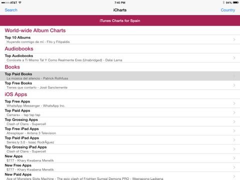 iCharts shows the top 40 entries for each of the iTunes charts for all countries. The initial iTunes chart summary page shows the top entry for each of the charts. Can select another country to see the iTunes charts for that country.