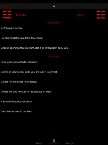 - Receive random daily iChing hexagrams in alerts at the hour of your choosing