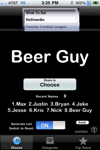 iChoose Random is the easiest and most affordable way to randomly choose anything! Use the built in categories or create your own categories. Add, edit, delete categories and selections on the fly! Use iChoose Random to decide: