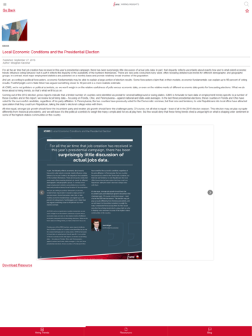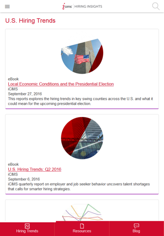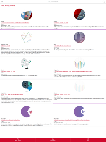 The iCIMS Hiring Insights app provides hiring professionals with a community for recruitment tips, HR technology developments, and industry insights. It provides eBooks, whitepapers, infographics, articles, and more. It also features a thought leadership blog, and Quarterly Hiring Trends reports chock-full of essential data for today’s talent acquisition landscape.