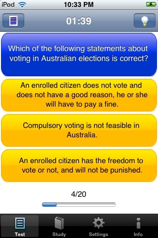 This is the FIRST app and so far the ONLY one to assist you in preparing for the NEW Australian citizenship test. It has a database of a large number of practice questions to help you to get familiar with the new test content. All the questions are based on the latest test resource book, "Australian Citizenship: Our Common Bond". You can study and take a practice test anywhere and any time you like, for example, when you are waiting for a bus or riding on a train. Remember, you must have enough practice before sitting your Australian Citizenship Test.