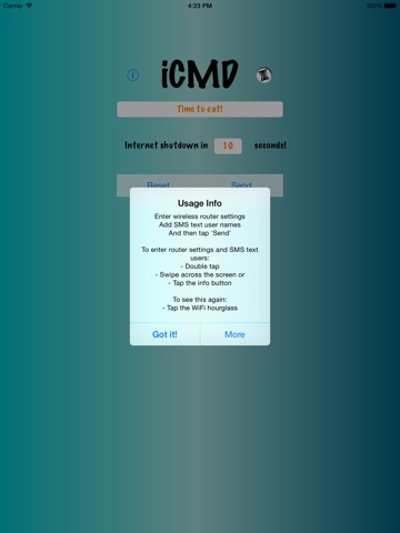 With iCMD and a single tap - send SMS text messages to WiFi users, wait for a programmable time, and then turn the WiFi router ON or OFF.