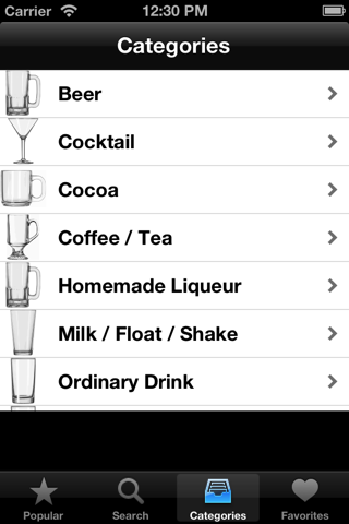 - Browse through an indexed list of drink categories.