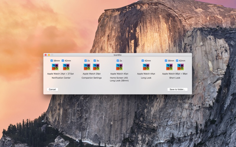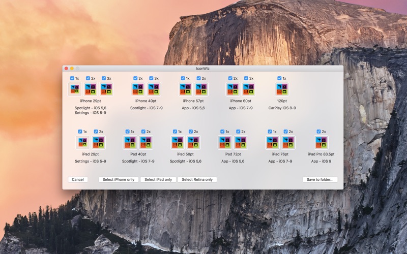 IconWiz helps you with generating icons for your iOS, OS X or Apple Watch projects. Just drag the designated icon on IconWiz, select the target platform, and it automatically generates all required icons in the right dimensions.