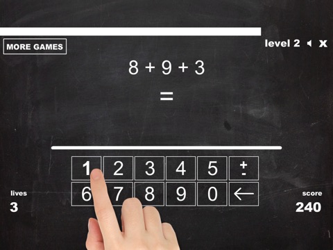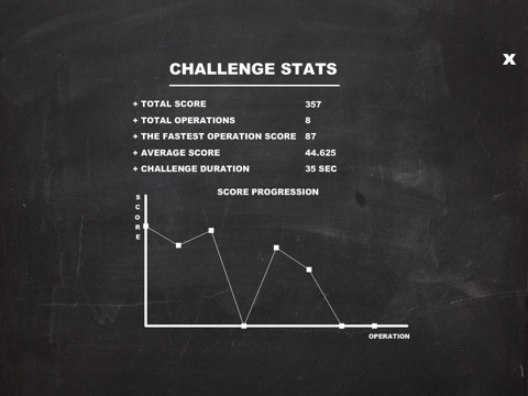 iCount is an ultimate math game in which you can practice 4 arithmetic operations - addition, subtraction, multiplication, division or their mix. The game contains many features that will surely increase your Math skills. There are 2 game modes - Challenge, where you must complete as many operations as you can in the time limit (your score depends on your speed) and Practice mode, in which you can practice as long as you need. In practice mode you can also choose how many operands you want to practice with and the operands range! Do not forget to submit your score for Challenge mode to a global leaderboard! For each challenge there are detailed stats (challenge duration, average score, graphs, etc) and each challenge is stored in cookies so you can see your progress under YOUR PROGRESS button.