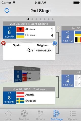 - Countdown, daily view, unified calendar with timezone support, groups data, graphical “2nd stage” table, matches results, scorers, events, statistics, formations