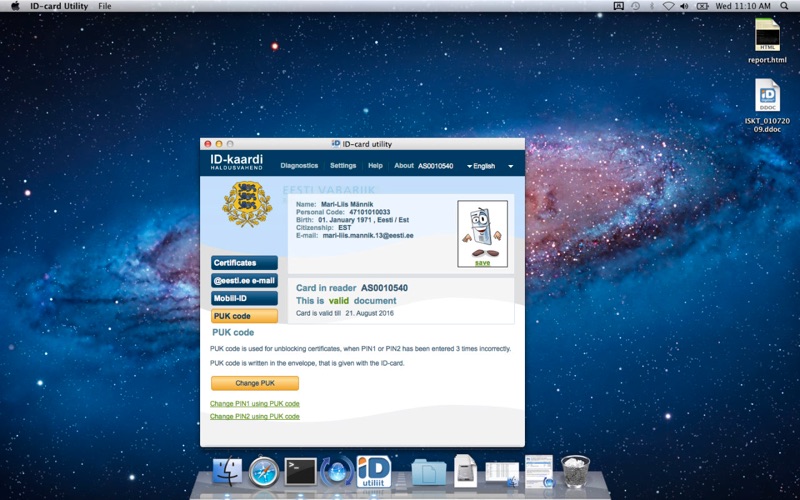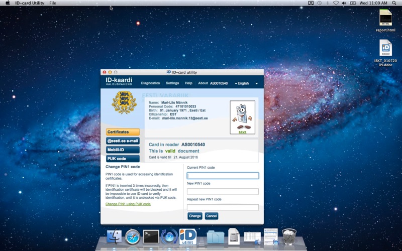 ID-card utility allows you check the ID-card operation and the validity of the certificates, change as well as unblock locked PIN codes and change the PUK code. In addition, the utility enables you to renew the certificates, create and configure @eesti.ee e-mail address and check validity of the Mobile-ID certificates.