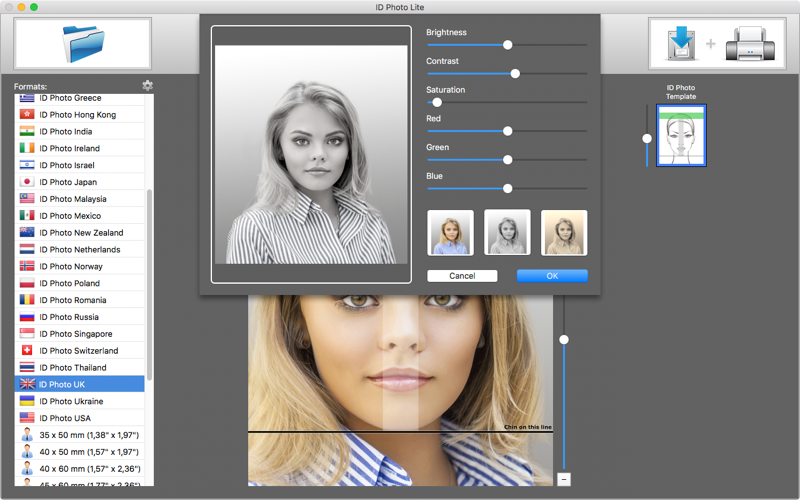 It comes with passport photo templates for 30 countries. Using the built-in editor, it is also easy to apply your own formats or change pre-defined formats. Up to 100 formats can be used. It also provides you with an export function so you can save the passport photo formats. Create your own passport photo formats and share these with colleagues or friends.
