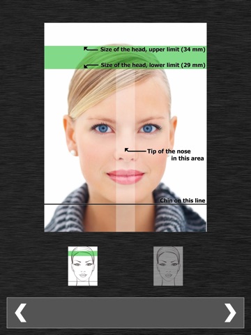 A passport-photo-template allows you to adjust the exact head height and the positioning of the nose.