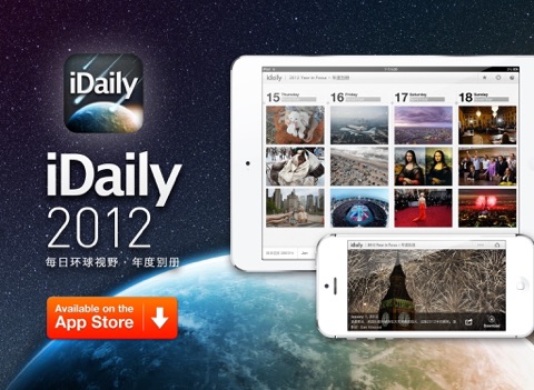 「iDaily·每日环球视野」首个年度回顾 app 别册,用一千张全球最顶尖的新闻图片,与你一同重温这颗星球上人类文明的 2012 年。