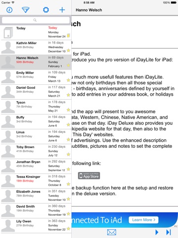 iDay supports the Apple Push Notifications Service to push not only the updating of the badge once a day then also a message on a free definable hour for upcoming events on this day. Both without a need to start iDay. So you never will forget important days!
